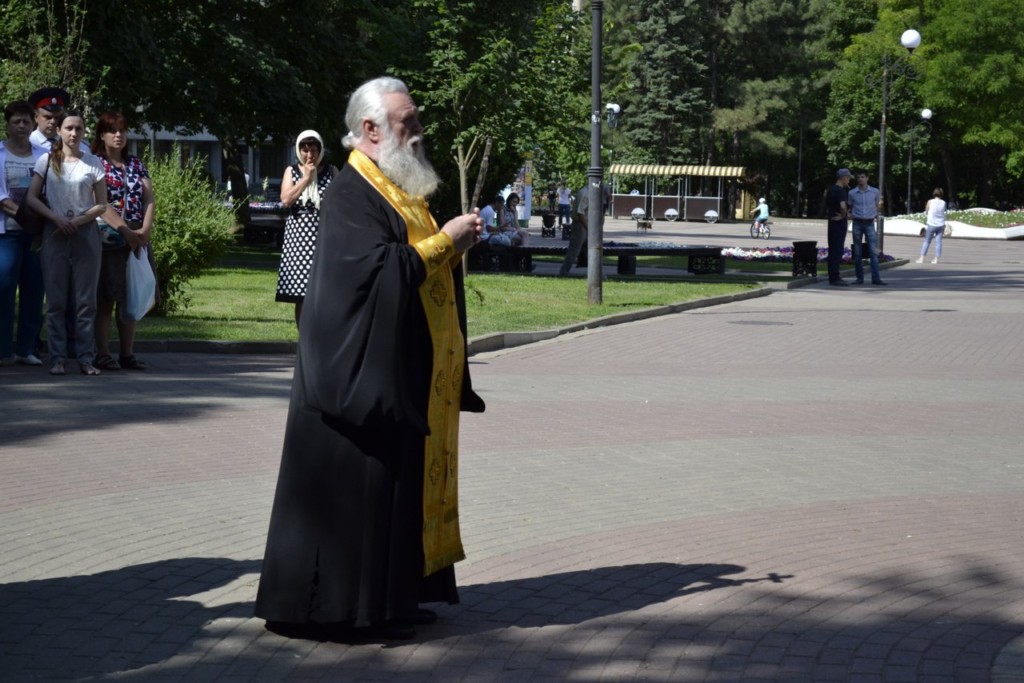 Благочинный Центрального округа г. Ростова-на-Дону, настоятель Благовещенского греческого храма протоиерей Геннадий Макаренко отслужил заупокойную литию по погибшим, затем обратился к присутствующим с пастырским словом.